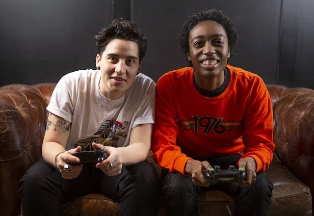 The Gender Spectrum Collective have worked with the people in the image who have identified their pronouns. If the alt text had not been provided, I would caption this image ‘Two friends playing video games laughing”.